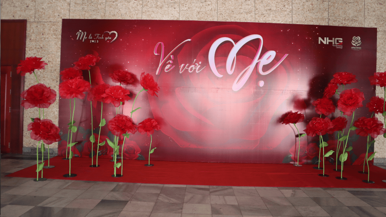 Lên sét Hoa hồng khổng lồ bằng vải voan dùng để trang trí backdrop sự kiện trong chương trình về với mẹ được tổ chức tại nhà hát Hoà Bình.